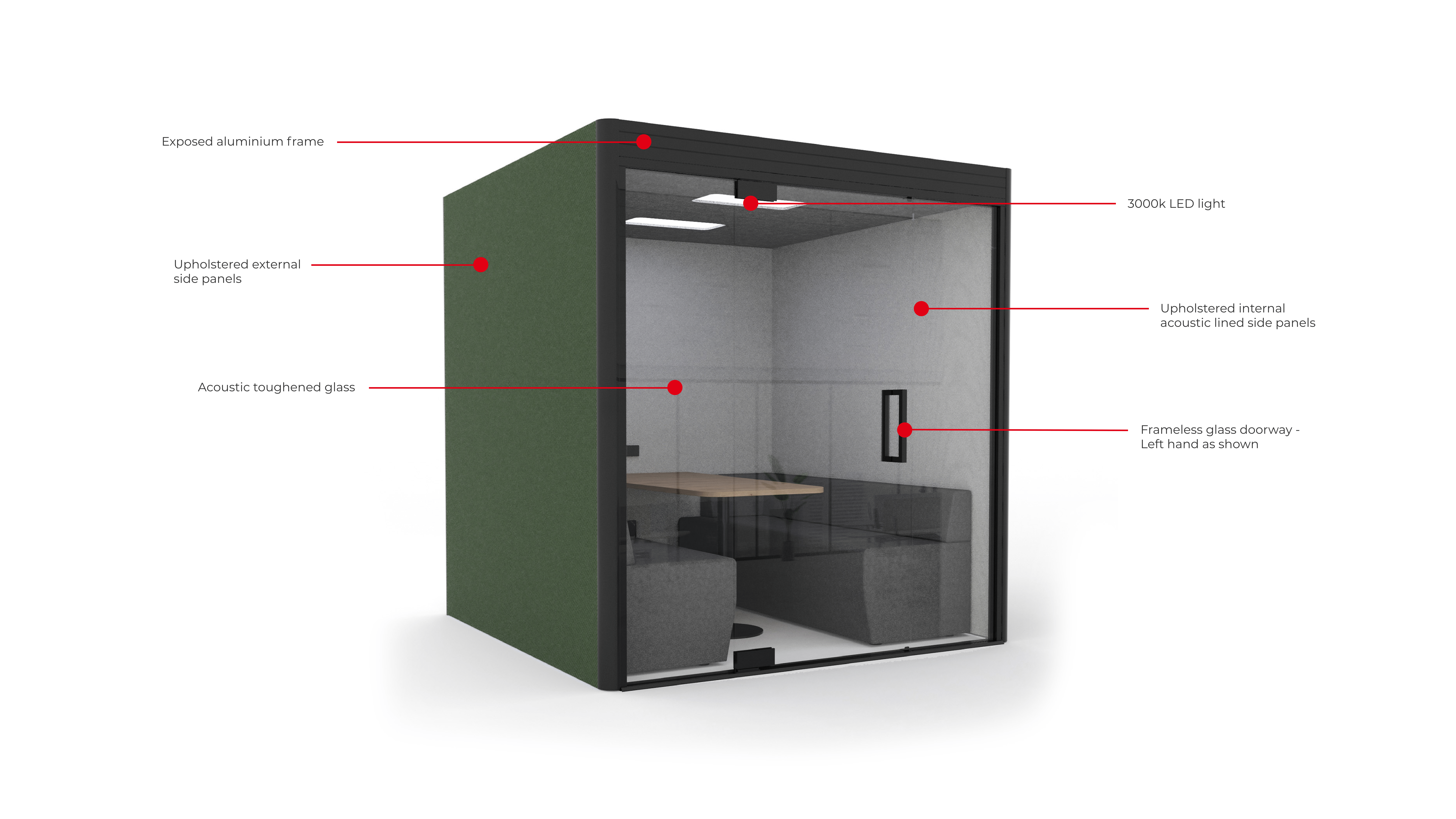 The Line Team Pod Cloud XL provides a peaceful environment for phone calls, video conferences, interviews, private meetings as well as a dedicated team working space, where four to six people can collectively focus on any allotted task, removing themselves from normal office distractions.