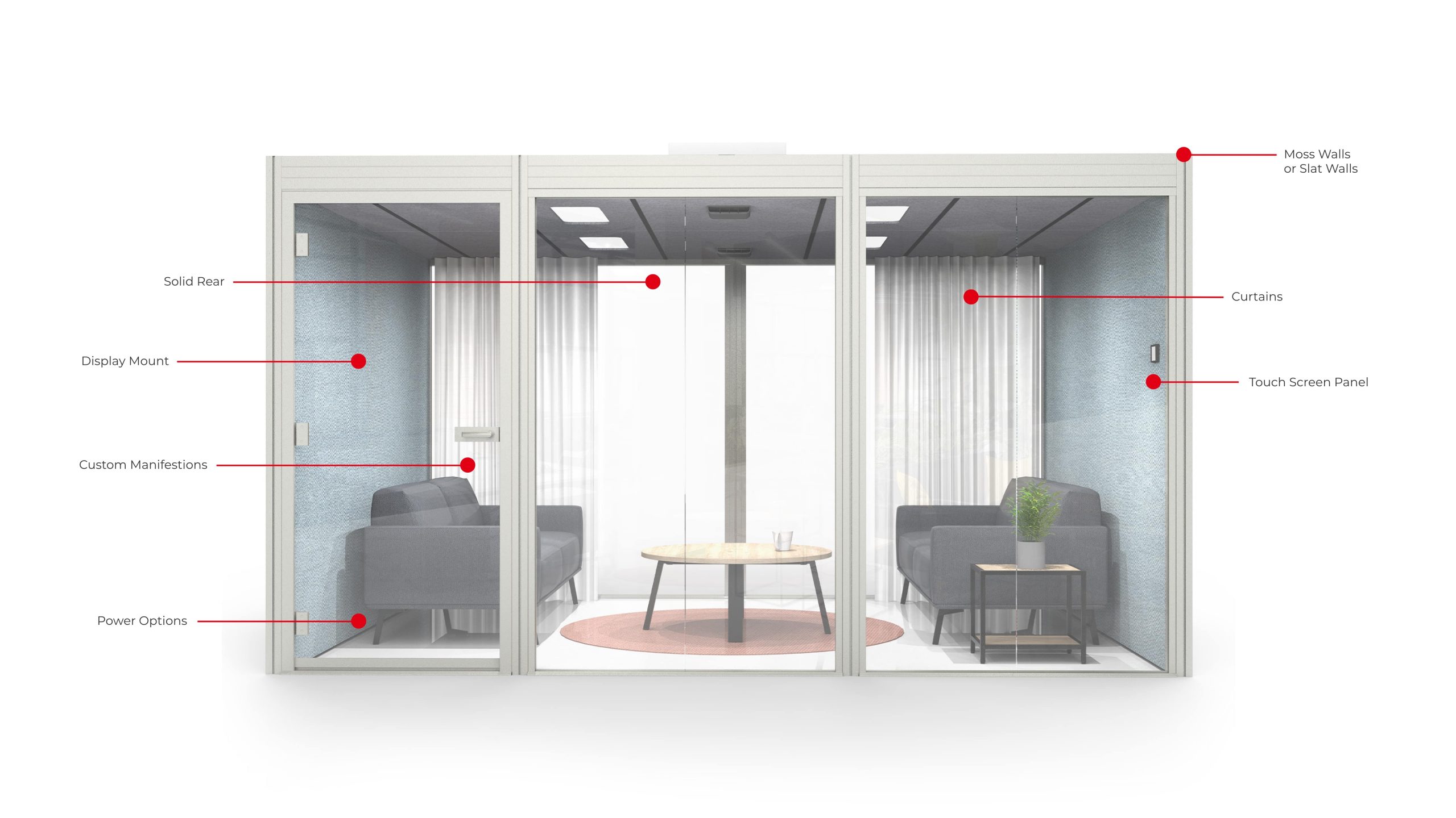 Combining advanced ventilation, lighting systems, and premium materials, Rooms delivers unmatched functionality and comfort across multiple configurations, accommodating up to 8 people.