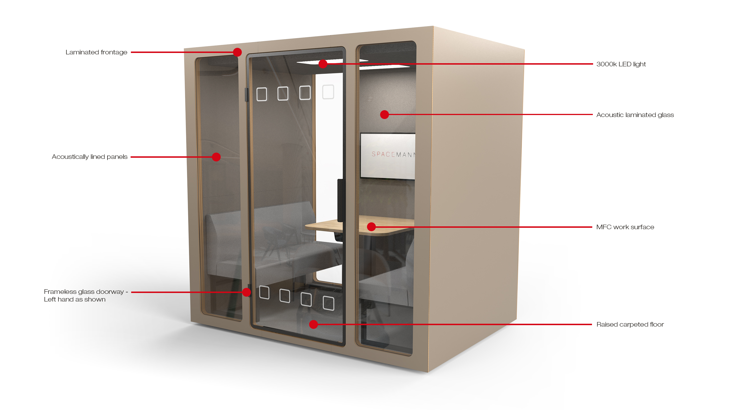 The Silence Team Pod M is designed for up to six people, perfect for larger team discussions or group projects. It combines spaciousness with excellent sound control while allowing crucial alarms to be heard.